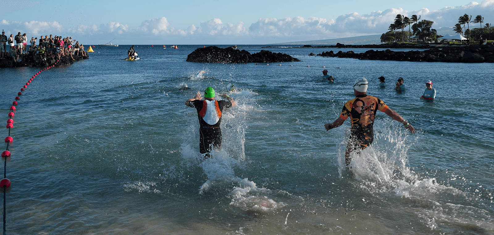 The race begins with a 1.2-mile single-loop, clockwise swim in the pristine waters of Pauoa Bay at the Fairmont Orchid. The saltwater environment offers excellent visibility and buoyancy, with a rolling start format that helps manage athlete density. The average water temperature hovers around 78°F (25.5°C), which typically makes the event non-wetsuit legal for age-groupers.
